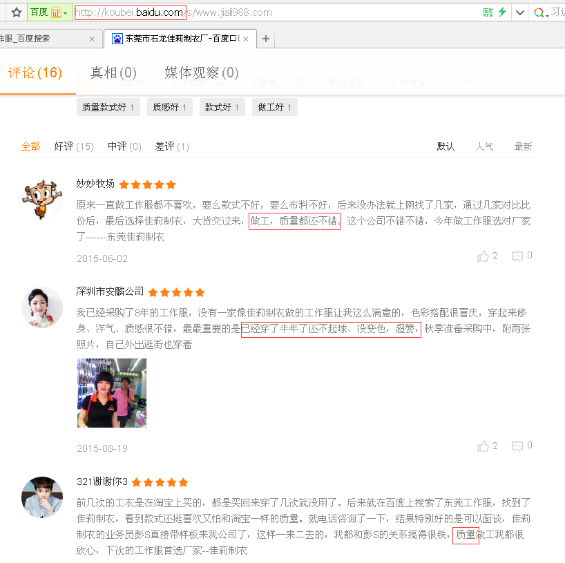 都是五星評價,這就是東莞市石龍佳莉制衣廠,在東莞地區(qū)專業(yè)從事服裝設(shè)計、生產(chǎn)、開發(fā)和加工服務(wù)。我們一直秉承“高起點、高標(biāo)準(zhǔn)”的管理理念,本著“質(zhì)量求生存,信譽謀發(fā)展”的宗旨贏得了客戶認同。我們憑著先進的設(shè)計、精湛的工藝生產(chǎn)出高品質(zhì)、高層次的職業(yè)服裝。