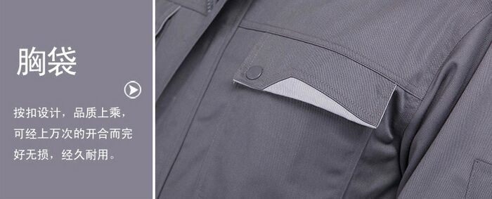 維修工作服以淺灰色為主色,口袋處用下搭式設(shè)計(jì),黃色拼接,袖口做工精細(xì),走線嚴(yán)密,結(jié)實(shí)耐磨時(shí)尚插袋,精細(xì)袖口,精致筆袋,松緊式下擺。